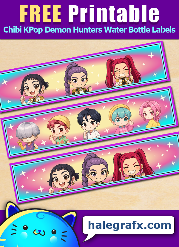 Calling all KPop Demon Hunters fans! Here are some Free Printable Chibi KPop Demon Hunters Water Bottle Labels in PDF format. Whether you are having a party coming up or simply love KPop Demon Hunters, these water bottles are a fun an inexpensive way to theme your party drinks!