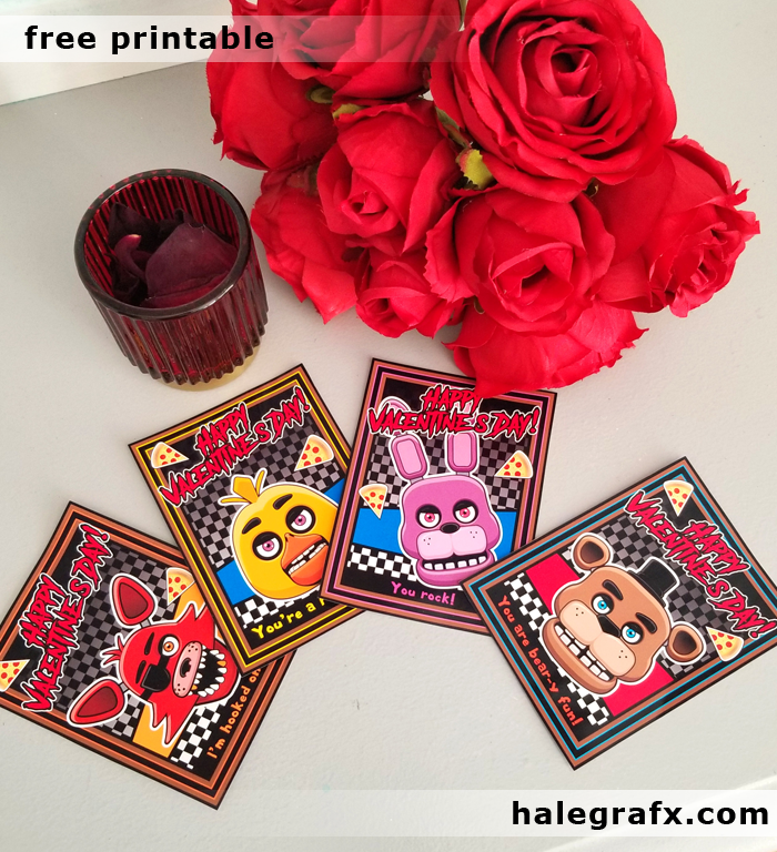 Also great to use these as Five Nights at Freddy’s labels on Valentine gift boxes or for digital scrapbooking. You can download your free printable Five Nights at Freddy’s valentines below.