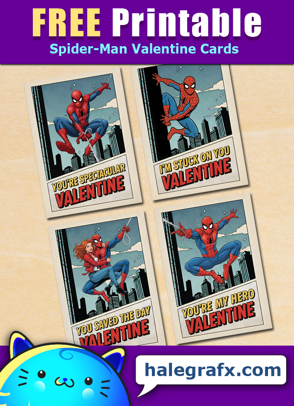 Also great to use these as Spider-Man Valentines labels on Valentine gift boxes or for digital scrapbooking. You can download your free printable Spider-Man Valentines below.