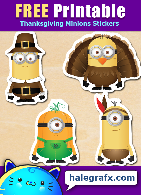 These free stickers have been optimized to print on machines such as a Cricut Air, Silhouette Cameo, or Starcraft Solo on vinyl sticker paper. You can also use them for scrapbooking, sticker collecting, party favors, on party favor bags or sticking to whatever suits you. You can certainly cut them by hand but these have been formatted so a cutting machine can read the lines and cut it for your you. Perfect for you, your friends and family on Thanksgiving day. These free Minions stickers are optimized to print at approximately 2.75 x 2.25 inches, but can be resized.